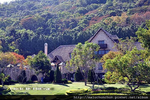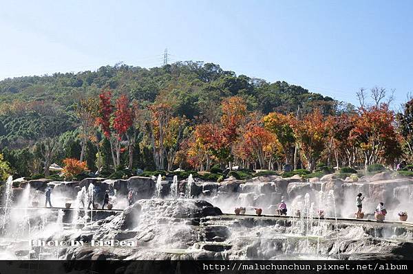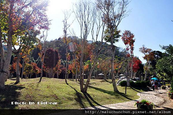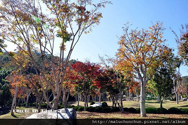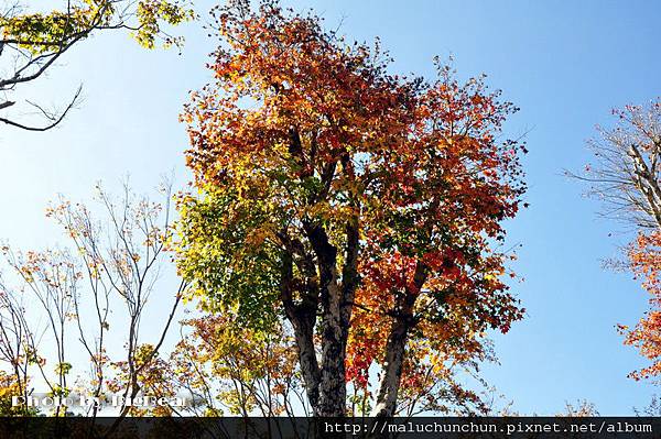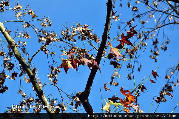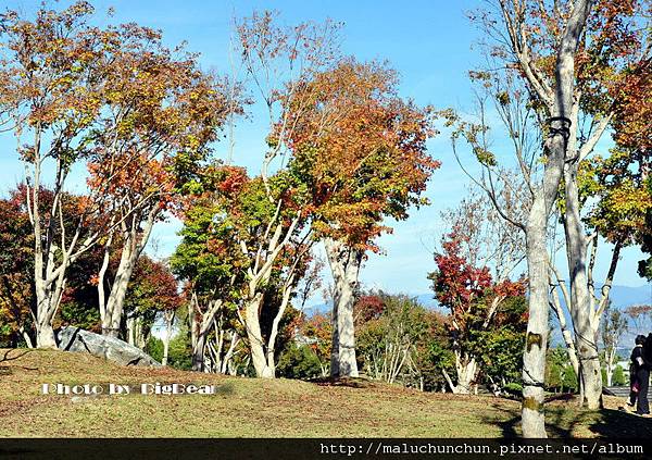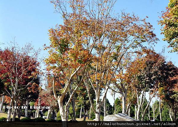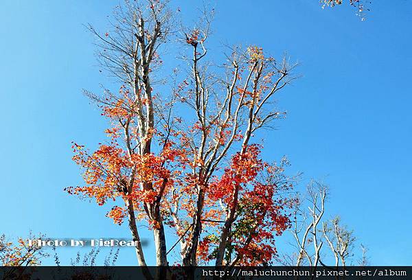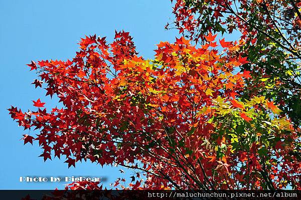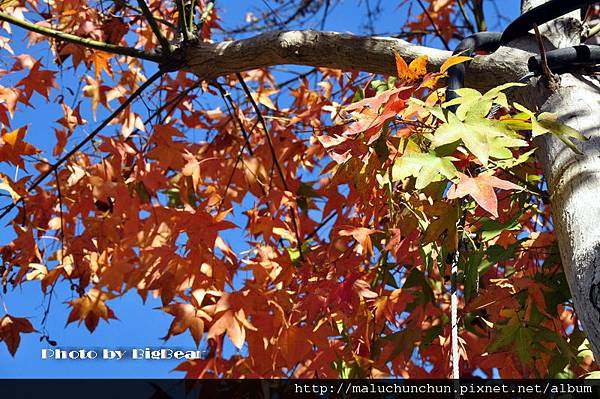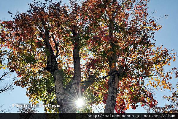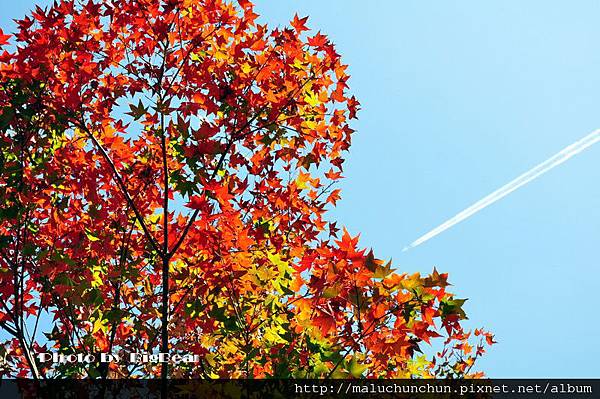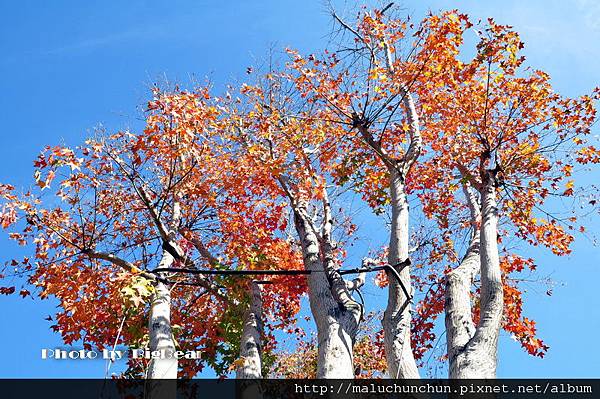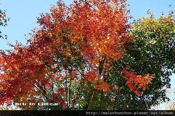 人客 人客 為什麼不看我 一直往那方向照 原來 新社莊園 楓樹林的槭樹紅啦火紅的楓葉 真撩人 難怪 人客們的相機 拼命照過去美麗的楓紅 在藍天映照下 更顯得光輝燦爛 大家 進來看一看吧解散完客人 大隻熊開好發票 可是迫不及待 直衝楓樹林 享受秋季的美好內