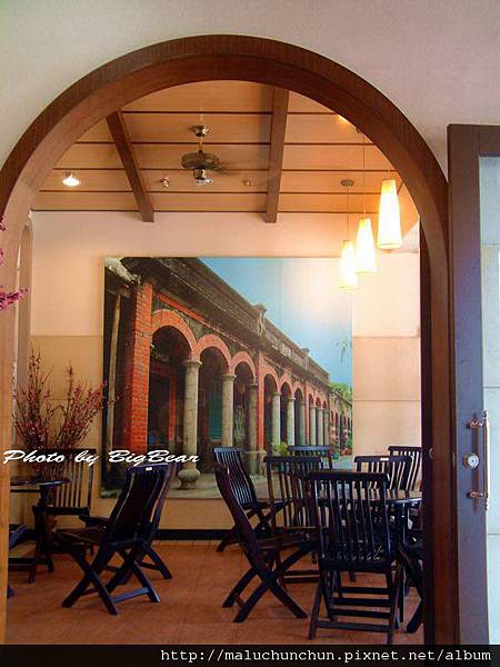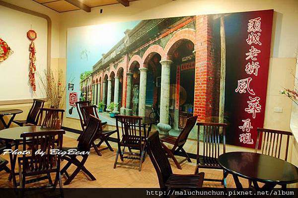店面以頭城美麗的老街為藍本 將紅磚拱門 石柱的老街海報 置於牆上
