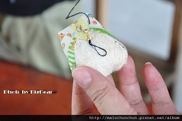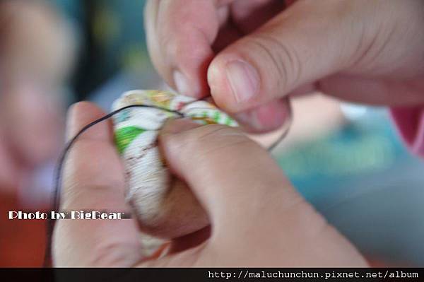 在三角袋塞入棉花後 將尾巴縫起來收口