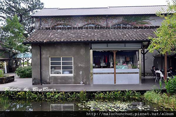 矗立在生態池上 有個小舞台 與相伴的木屋連結 可以成為專業的環境劇場