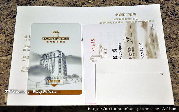 辦理入住時 櫃枱人員會將房卡 早餐券 放入有寫房客姓名的信套內~