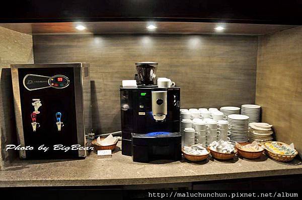 在交誼廳外 備有飲水機還有全自動研磨咖啡機